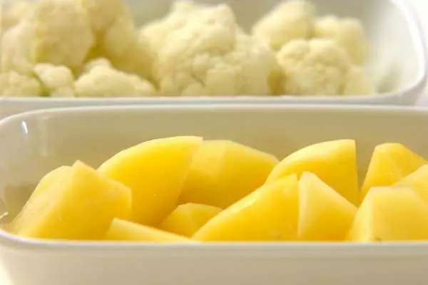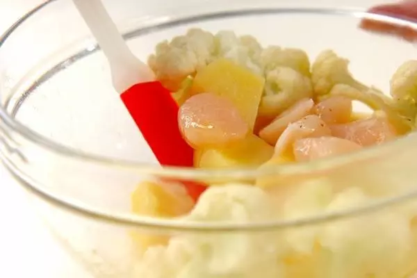 1、カリフラワーと水気をきったジャガイモは耐熱容器に入れ、ラップをかけて電子レンジで3~5分加熱する。粗熱が取れたら冷蔵庫で冷やす。