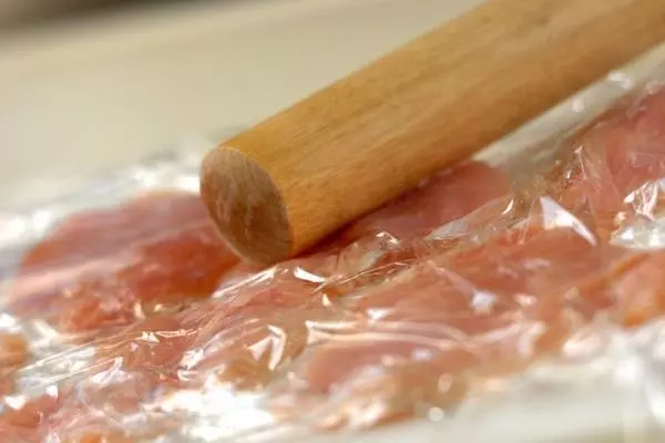 1、鶏むね肉は皮を取り除いて8枚の削ぎ切りにし、ラップで挟んで麺棒で繊維を断ち切るようにたたき、薄く伸ばす。