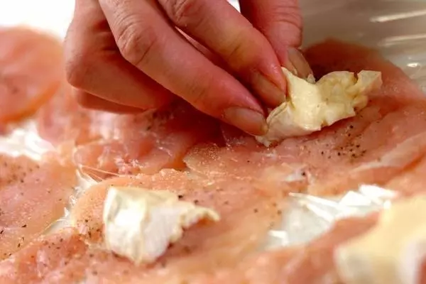 2、塩コショウをふり、半分にちぎったカマンベールチーズを中央にのせて半分に折る。