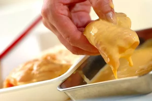 3、<バッター液>の材料を混ぜ合わせ、トロリとするまで分量外の水で調整する。(2)を<バッター液>にからませる。パン粉をしっかりとつける。