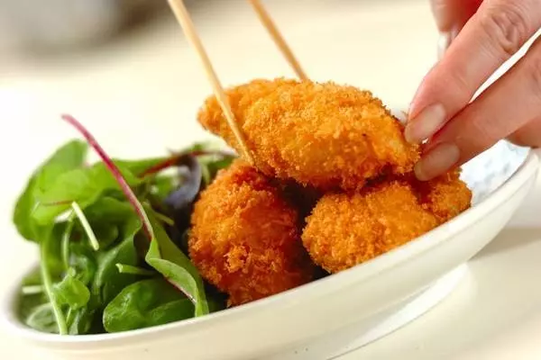 4、170℃の揚げ油できつね色になるまで揚げ、ベビーリーフ、プチトマトと共に盛り合わせる。