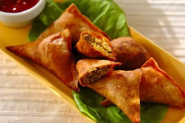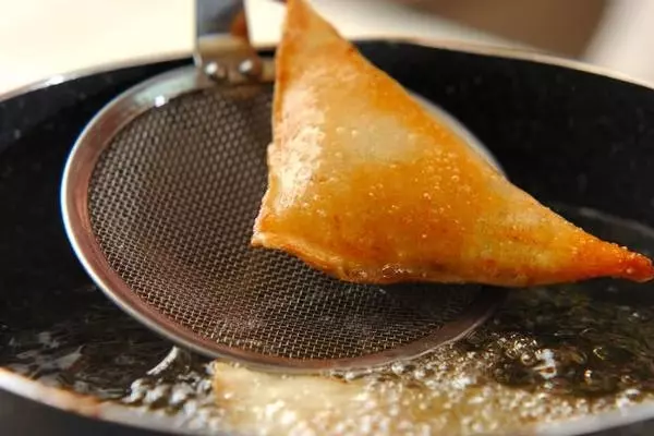 じゃがいもやグリーンピースなどを茹でて潰し、クミン、コリアンダーなどのスパイスで調味して、小麦粉、塩、水、油を混ぜ合わせて作った皮で包んで油で揚げたものです。