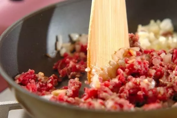 1、フライパンにサラダ油をひき、玉ネギ、ショウガを炒め、しんなりしたら牛ひき肉を加え、ほぐしながら中火で色が変わるまで炒める。