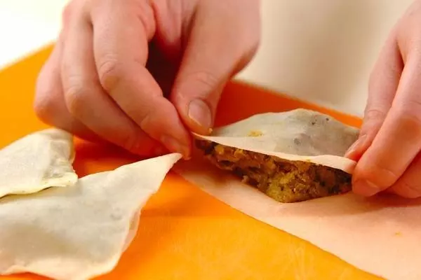 3、春巻きの皮は縦2等分にし、1枚の端に(2)の具をのせ、三角に折りたたみながら包み、巻き終わりに<小麦粉のり>をぬって留める。残りも同様にする。