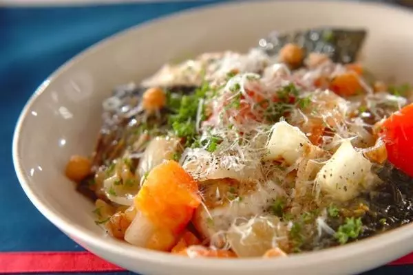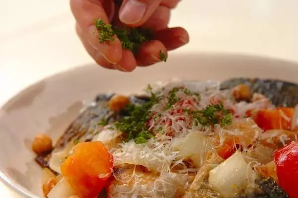 5、分量外の塩で味を調えて器に盛り、パルメザンチーズ、パセリ、粗びき黒コショウを振る。
