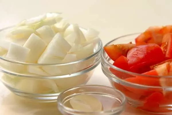 2、玉ネギは1.5cm角、トマトは2cm角に切る。ニンニクは芽を取る。