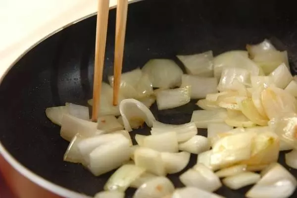 3、フライパンにオリーブ油とニンニクを入れて弱火にかけ、香りがたったら玉ネギを透き通るまで炒め、フライパンの端に寄せる。