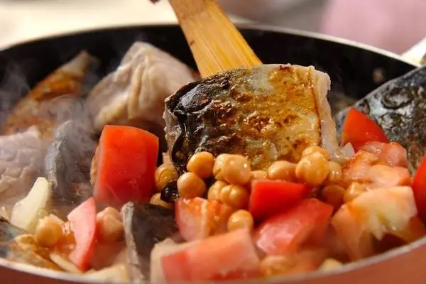 4、サバを皮目から入れ、中火で両面に焼き色をつけ、トマト、ヒヨコ豆を加えて全体を混ぜ合わせる。<調味料>の材料を入れて蓋をし、弱火で約5分煮る。