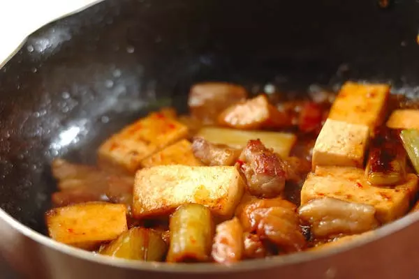 1、フライパンにサラダ油を熱し、豚バラ肉の色が変わるまで炒め、白ネギ、木綿豆腐を加えて炒め合わせる。全体に焼き色がついたらだし汁、<調味料>の材料を加え、強火にして煮たってきたらアクを取る。