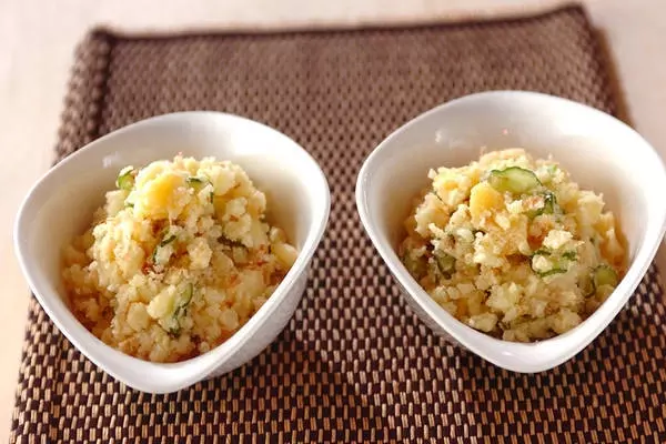 3、ジャガイモが熱い間に皮をむき、マッシャーでつぶし、バター、塩コショウを混ぜ合わせる。(2)と合わせ、最後にかつお節を混ぜ合わせて器に盛る。
