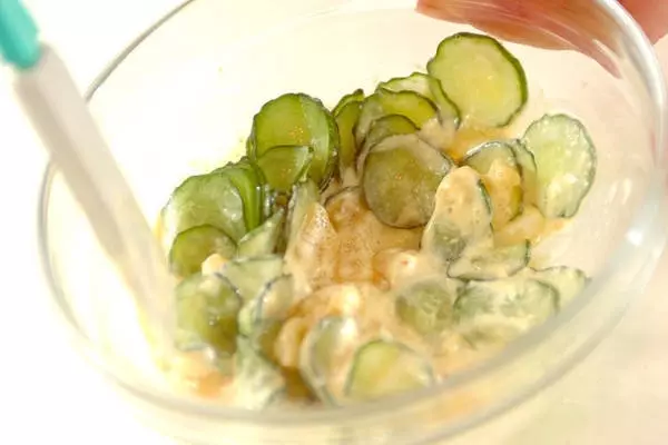 2、数の子は小さく刻む。キュウリは薄い輪切りにして塩をからめ、水分が出てきたらサッと水洗いして水分を拭き取る。<調味料>の材料を混ぜ合わせ、数の子、キュウリも混ぜ合わせる。