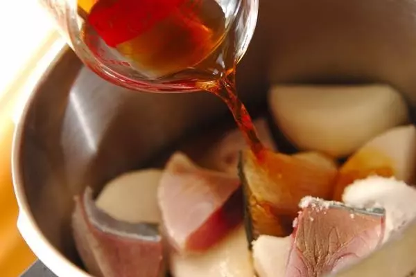 1、圧力鍋に大根、ブリ、ショウガ、<調味料>の材料を入れて蓋をし、5分加圧する。