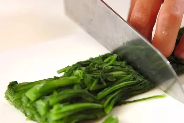 1、春菊は熱湯でサッとゆでて冷水に取り、粗熱が取れたら水気を絞り、長さ4cmに切る。
