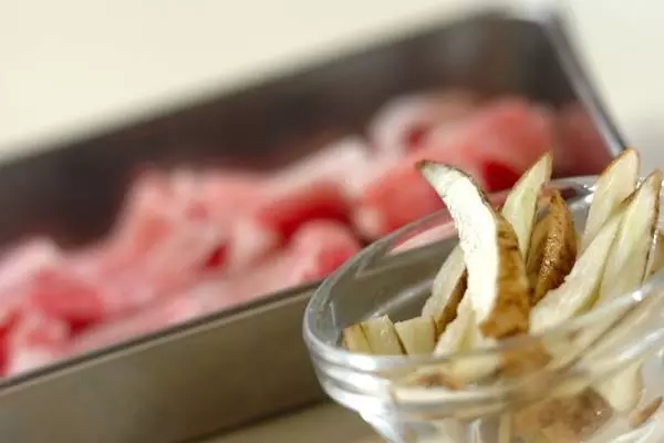 ・豚バラ肉は長さ3cmに切る。ゴボウはタワシでこすりながら水洗いし、縦半分に切って斜め薄切りにする。