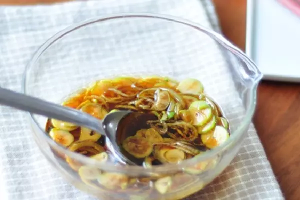 3、<ネギソース>を作る。長ネギは小口切り(端から輪切り)にし、他の調味料と混ぜ合わせる。