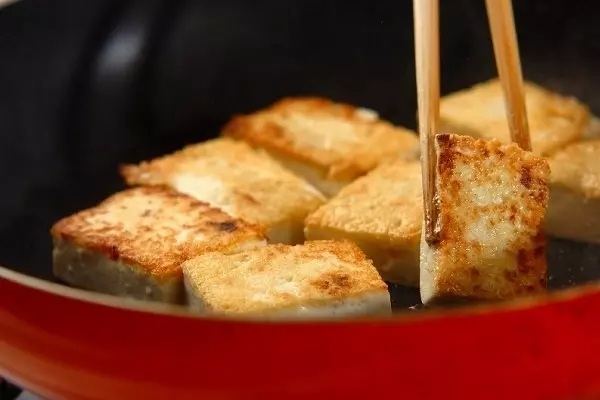 1、フライパンにゴマ油を熱して木綿豆腐を並べ、全体に焼き色を付けていったん取り出す。