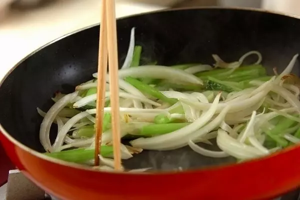 2、同じフライパンにサラダ油、玉ネギ、小松菜の茎を入れて強火にかけて炒める。しんなりしたら葉とニンニクを加えて炒め合わせる。