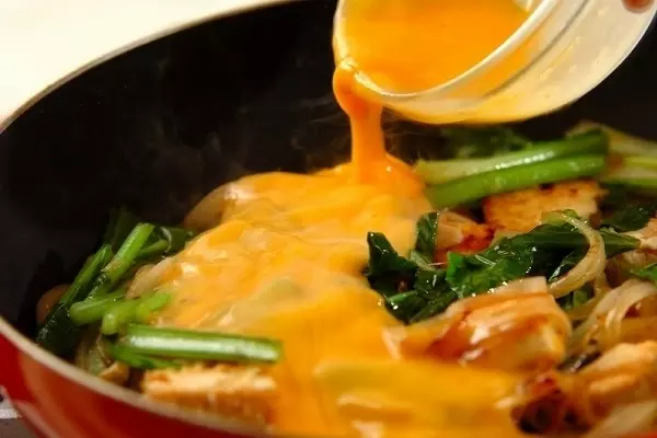 4、溶き卵をまわし入れてお好みのかたさに火を通し、器に盛る。