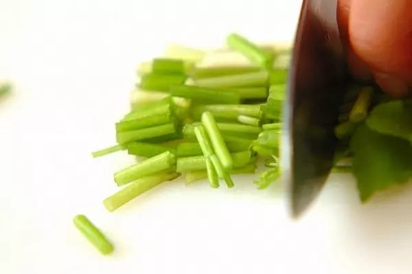 1、セリは洗って水気をよくきり、根元を切り落として幅1cmに切る。