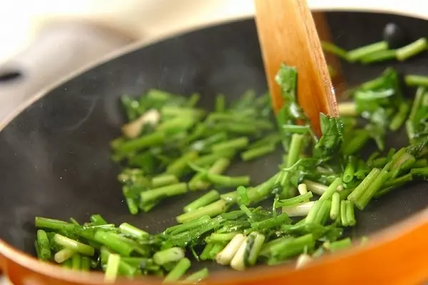 2、フッ素樹脂加工のフライパンを中火にかけ、かつお節を乾煎りする。パリッとしたら器に取り出す。同じフライパンにサラダ油を熱してセリを炒め、全体に火が通ったら、しょうゆを鍋肌からまわしかけ、火を止める。