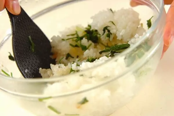 3、ボウルにご飯を入れ、(2)のセリを混ぜ、さらにかつお節も加えて混ぜ、お好みの大きさのおにぎりにする。