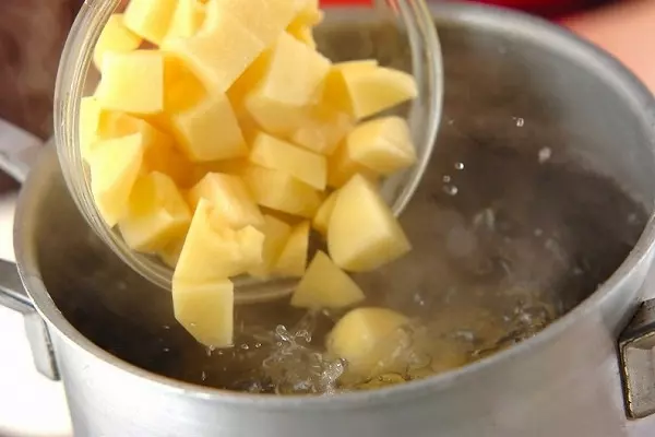 1、大きめの鍋にたっぷり湯を沸かし、塩を加えてパスタとジャガイモを入れ、ゆで始める。