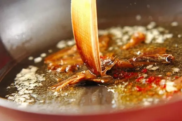 2、フライパンにオリーブ油、ニンニクを入れて弱火にかけ、香りがたってきたらアンチョビ、赤唐辛子を加えアンチョビを潰すように炒める。