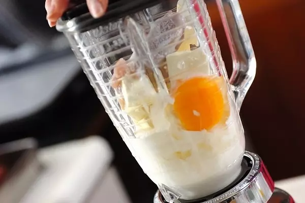 3、オーブンを160℃に予熱し始める。ミキサー、またはフードプロセッサーにクリームチーズ、カマンベール、グラニュー糖、桜あん、卵、生クリームを入れ、滑らかになるまで攪拌する。