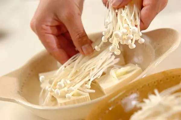 1、豆腐は6~8つに切り、2つの耐熱容器に分けて入れる。白ネギは縦半分に切って斜め薄切りにし、エノキは石づきを切り落として半分に分け、耐熱容器に入れる。