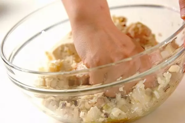 1、ボウルに鶏ひき肉、木綿豆腐、水煮タケノコ、シイタケ、白ネギ、<合わせ調味料>の材料を入れ、よく混ぜ合わせる。