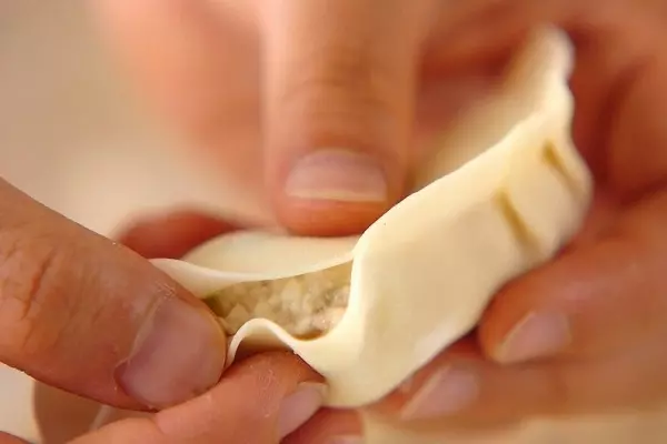 2、餃子の皮を手に取り、(1)の種を大さじ1位のせ、皮のフチに水をグルッと1周薄くぬり、しわをよせながら包む。