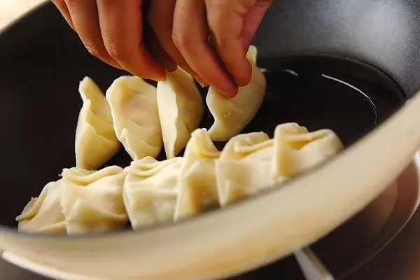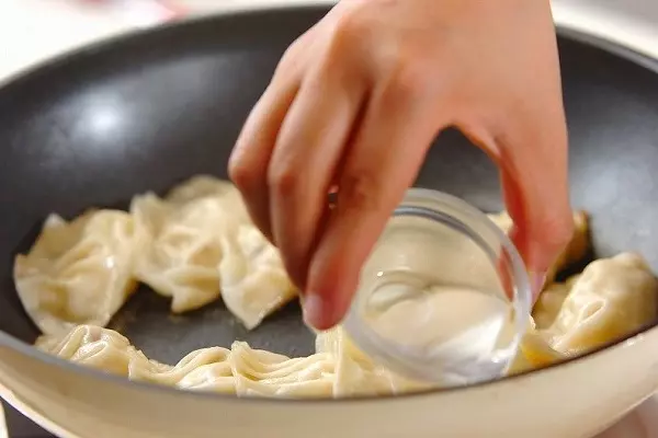 3、フライパンにサラダ油を中火で熱し、餃子を並べて底がこんがりと焼けるまで焼く。