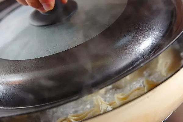 4、熱湯を餃子が1/4つかるくらいまで入れ、強めの中火にかける。蓋をして弱めの中火で約3~4分蒸し焼きにする。