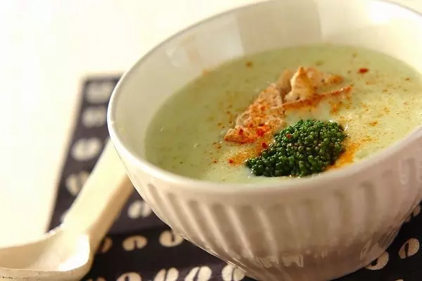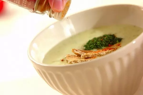 3、再び煮たつ直前に生クリームを加え、塩で味を調えてバターを加え、ひと混ぜする。器に注ぎ、砕いたクラッカー、飾り用のブロッコリーを入れ、粉パプリカを振る。