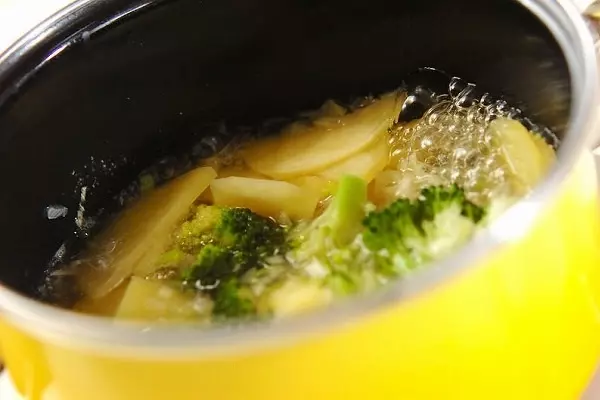 1、鍋に<スープ>の材料、ブロッコリー、水きりしたジャガイモ、白ネギを入れて強火にかける。煮たったら火を弱めて6~7分煮る。