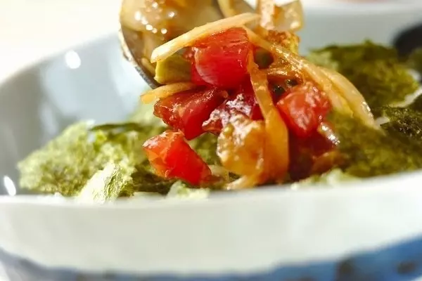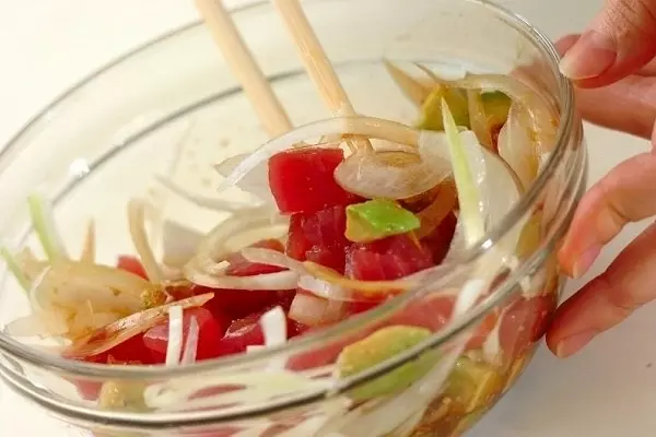 1、ボウルに<和えダレ>の材料を混ぜ合わせ、マグロ、アボカド、玉ネギを加えて混ぜ合わせる。