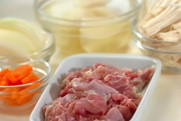 1、鶏もも肉は食べやすい大きさに切る。ジャガイモは皮をむき、4つに切る。玉ネギは幅2cmのくし切りにする。ニンジンは皮をむき、厚さ5mmの半月切りにする。エノキは根元を切り落とし、長さを半分に切る。
