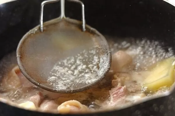 2、鍋に鶏もも肉、ジャガイモ、水を入れて強火にかけ、沸騰したらアクを取る。蓋をずらしてのせ、弱火で約5分煮る。