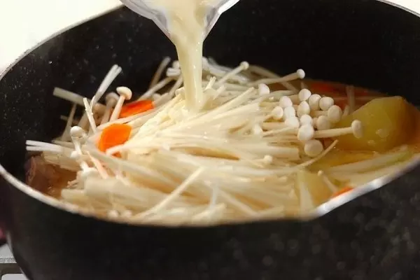 3、酒粕とみそを(2)の煮汁で溶いてから(2)に加える。玉ネギ、ニンジン、エノキ、豆乳を加え、蓋をして弱火で7~8分程煮る。