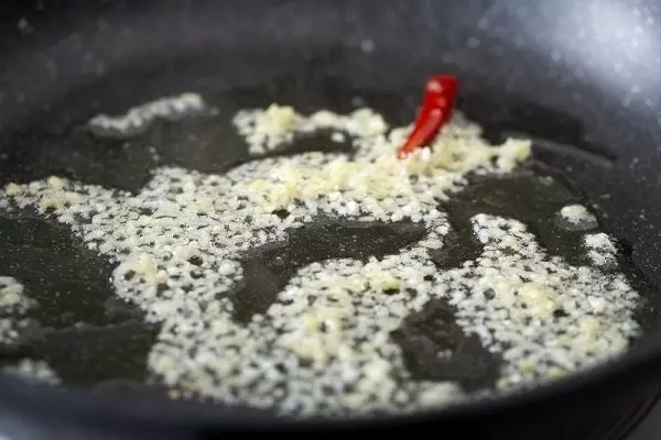 1、深めのフライパンにサラダ油大さじ1を入れ、弱火で熱し、ニンニク、ショウガ、赤唐辛子を加える。