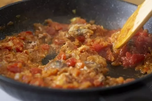 3、レンジで火を通した玉ネギ、水気を切ったサバ缶と、カットトマト缶を加える。サバをほぐしながら水分を飛ばすように中火で5分ほど炒める。