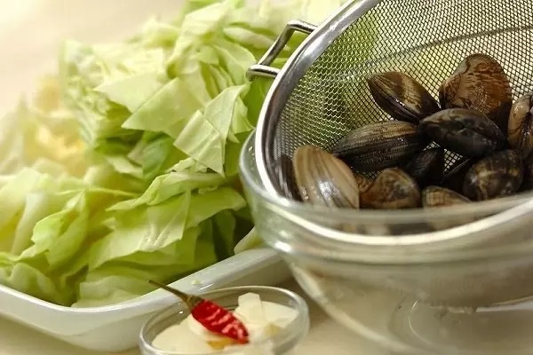 1、アサリは水洗いしておく、キャベツはザク切りにする。ニンニクは薄切りにする。