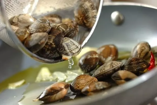 2、フライパンにオリーブ油、ニンニクを入れて弱火にかけ、香りが出てきたら、アサリ、白ワイン、種を出した赤唐辛子を入れる。