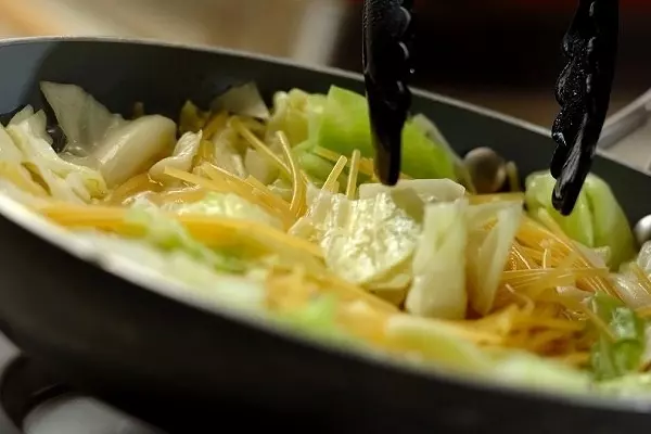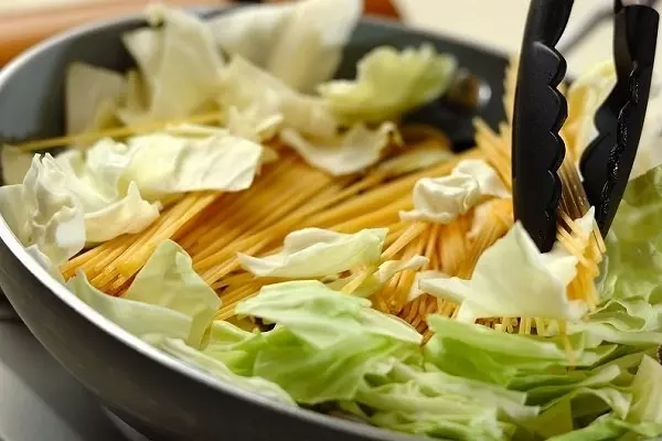 3、アサリが開いたら水を注ぎ入れ半分に折ったスパゲディー、キャベツ、塩を入れる。ひと混ぜしたら蓋をして中火で袋の表記時間煮る。