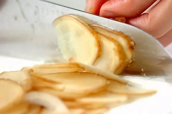 ・ショウガはよく洗い、皮ごと繊維を断ち切るように薄切りにする。