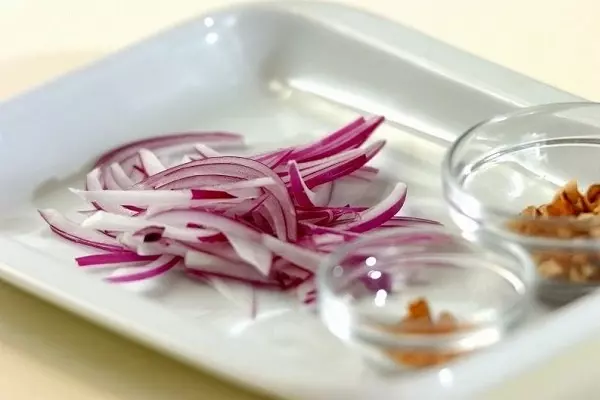 紫玉ネギの辛味が苦手な場合は、水に放って辛味を抜き、ザルに上げて水気をきってください。
