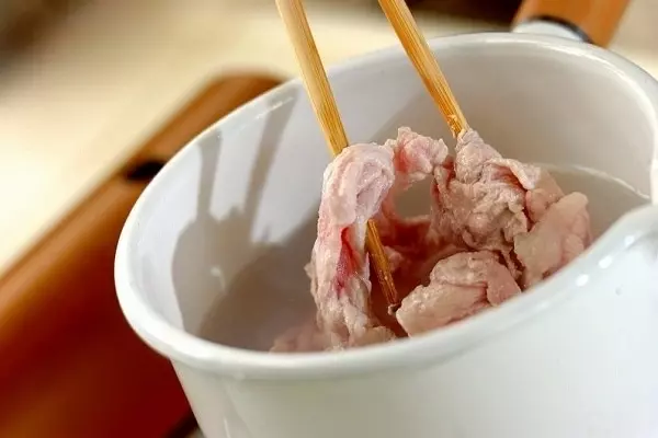 1、鍋に湯を沸かし、火を止めて豚肉を入れてほぐす。再び強火にかけ、煮たったらザルに上げて水気をよくきる。