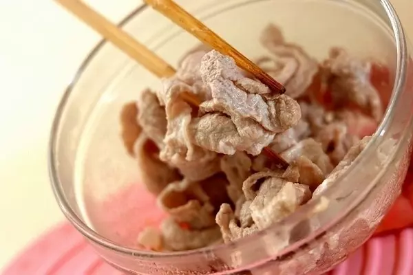 2、ボウルで<豚しゃぶ>の砂糖とナンプラーを合わせ、(1)をからめる。