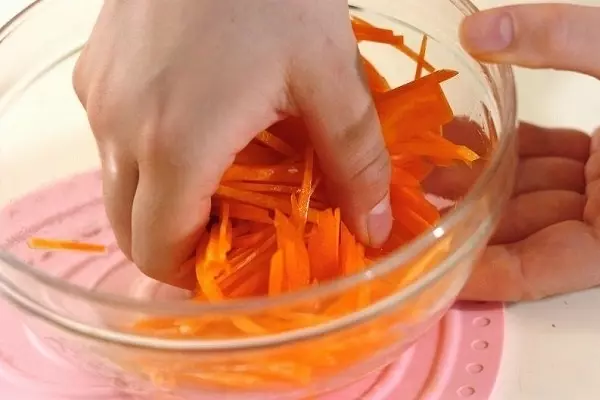3、ニンジンは皮をむいて薄い輪切りにし、さらに細切りにする。<ニンジンなます>の材料をボウルに入れ、しんなりするまでもむ。