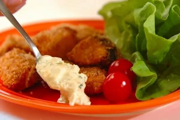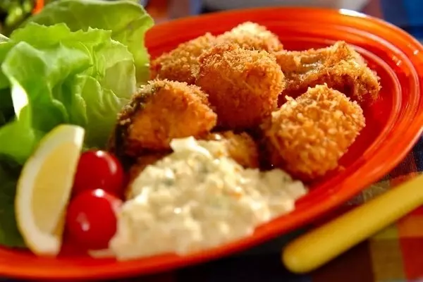 2、(1)を揚げ油で色よく揚げ、油をきる。器にプチトマト、レモン、サラダ菜と共に盛り合わせ、<タルタルソース>を添える。